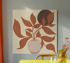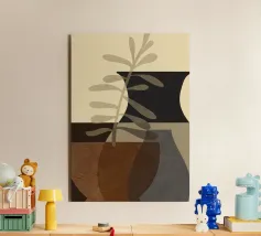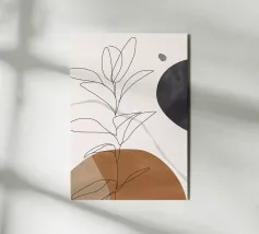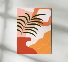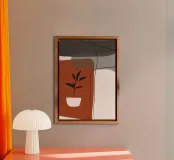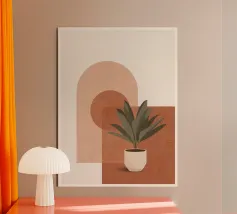 Il design minimalista è caratterizzato da una semplice pianta in vaso con foglie scure, contrapposta a forme astratte e sovrapposte nei toni terrosi del rosso, del grigio e del bianco. Le linee pulite e i blocchi di colore decisi creano un'estetica moderna e rilassante.