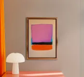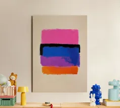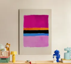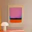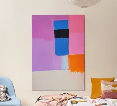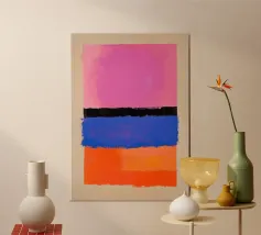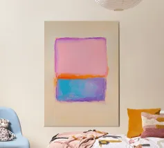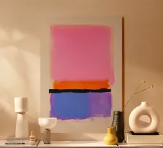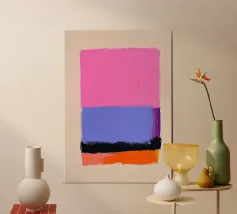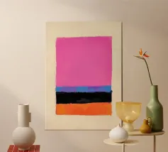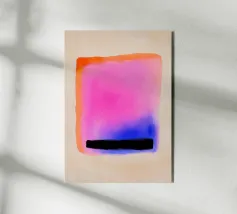 Un dipinto minimale e misterioso con campi di colore, una forma astratta. Lo sfondo è rosa chiaro, mentre il motivo principale è nei toni del viola, dell'arancione, del nero e del blu, creando un contrasto e un equilibrio tra spazio negativo e forma positiva. Vista aerea.