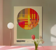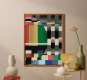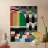 Un vivace assortimento di forme geometriche e colori vivaci si unisce per creare una composizione dinamica che ricorda gli schemi di prova televisivi. Il gioco di quadrati, rettangoli e cerchi in varie tonalità crea un contrasto visivo di grande impatto.