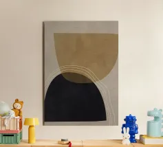 Arte astratta moderna con forme geometriche e organiche combinate con linee e texture in uno stile retrò di tendenza con toni giallo ocra, marrone e grigio. Questa serie si adatta bene a vari stili abitativi come il design, il retrò, il minimalismo, l'industria, gli interni eclettici. Adatto per studio, sala d'attesa, ingresso, soggiorno o camera da letto.
