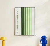 Classico esempio di design grafico Bauhaus, questo poster presenta una straordinaria composizione verticale interamente incentrata sul colore e sulla linea. Il disegno presenta cinque spesse strisce verticali che formano un bellissimo gradiente di verdi, passando dal verde bosco intenso a sinistra al verde lime pallido a destra. Ogni striscia è separata da uno spazio bianco pulito, creando un ritmo visivo. Il testo "BAUHAUS EXHIBITION 1919" è ben visibile in verticale sul lato sinistro. Questa stampa digitale ad alta risoluzione (7000x5000 pixel, 300 dpi) offre una fedeltà cromatica e una nitidezza impeccabili, perfette per un'immagine di grande impatto.