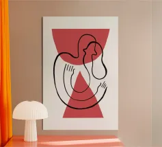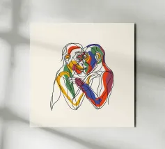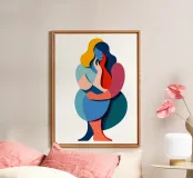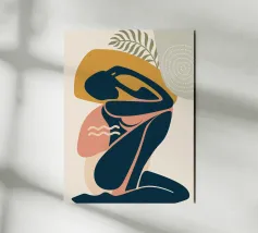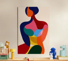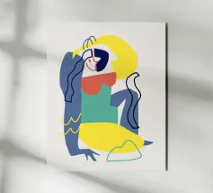Una composizione astratta stilizzata presenta forme sovrapposte dai colori vivaci, che danno l'impressione di una persona seduta. L'uso audace di blu, rosso, arancione e verde acqua crea un senso dinamico di movimento e forma.
