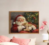 Un'immagine natalizia che scalda il cuore e che infonde sicurezza: Babbo Natale siede rilassato davanti all'albero decorato a festa e tiene in braccio un gattino che dorme pacificamente. I colori tenui e la luce calda conferiscono alla scena una calma magica, simbolo dell'amore, della pace e della tranquilla gioia del periodo natalizio.
