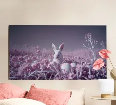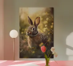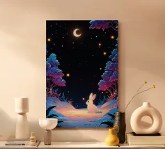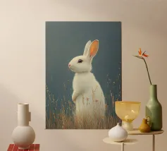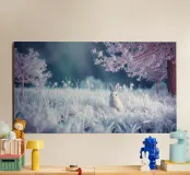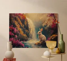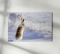 Paesaggio innevato con un coniglio in una foresta mistica alluminio dibond