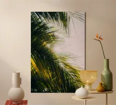 Una composizione dettagliata di fronde di palma illuminate dal sole che si sovrappongono in curve eleganti. Con un morbido sfondo verde acqua e accenti architettonici, questa immagine offre una fresca prospettiva tropicale, ideale per l'arredamento editoriale o per spazi di ispirazione botanica.