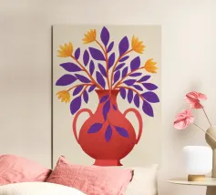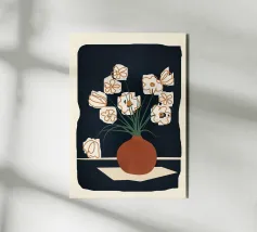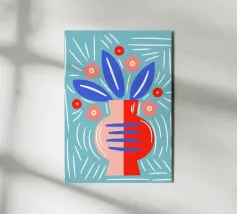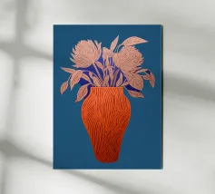 Natura morta di un bouquet di fiori blu stilizzati in un vaso arancione a forma di zucca, che crea una composizione floreale unica e popolare.