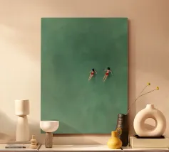 Scivolando fianco a fianco in un mare turchese, due nuotatori tracciano percorsi sincronizzati che si increspano verso l'esterno in archi delicati. Realizzato con audaci pennellate di olio, "Parallel Currents" cattura un tranquillo duetto di movimento e quiete, dove le figure umane e la distesa acquatica si fondono in un sereno balletto di colori e forme.