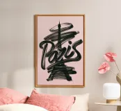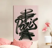 Questo poster moderno presenta la Torre Eiffel leggermente delineata dietro pennellate calligrafiche nere e dinamiche che scrivono "Paris" su uno sfondo rosa tenue. Artistica ed energica, l'illustrazione bilancia l'eleganza urbana e le vibrazioni femminili di tendenza con un impatto creativo.