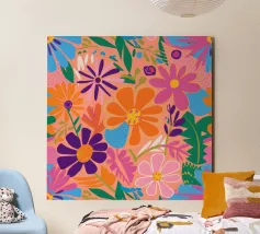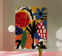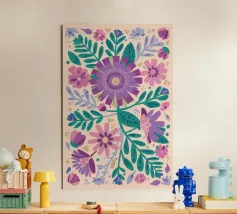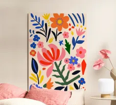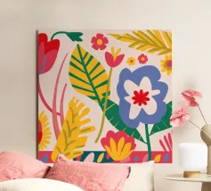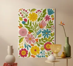 Una bella macchia di fiori selvatici stilizzati e stravaganti è illustrata in un affascinante stile ispirato all'arte popolare, con un delizioso mix di colori e forme che irradiano gioia e bellezza naturale.