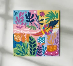 Una griglia di flora astratta, texture e vasi crea un giardino organizzato di giocosa varietà.