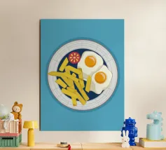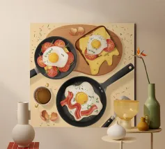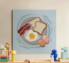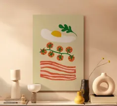 Un'illustrazione semplice e appetitosa di un classico piatto da colazione con un uovo perfettamente fritto, bacon croccante e una fetta di pomodoro su pane tostato.
