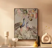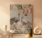 Questo collage vintage cattura l'eleganza dei tropici con una splendida composizione di lussureggianti foglie tropicali e frutti vivaci. Al centro, due splendidi pavoni si ergono con grazia, con le loro piume iridescenti che brillano nei toni del blu, del verde e dell'oro. Il maestoso piumaggio dei pavoni contrasta con il ricco fogliame, aggiungendo un senso di raffinata bellezza. Le sottili texture vintage dello sfondo esaltano l'eleganza generale, mentre i colori vibranti delle foglie e dei frutti danno vita alla scena, evocando un paradiso esotico senza tempo.