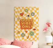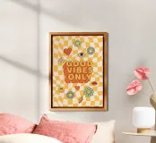 Riempite il vostro spazio di positività e stile con questa stampa digitale "Good Vibes Only". Questo vivace design grafico presenta il messaggio edificante in un testo arancione stratificato, su uno sfondo dinamico a scacchi gialli e bianchi, circondato da illustrazioni giocose di fiori sorridenti, cuori, emoji e altri simboli divertenti. L'immagine incarna un'estetica di ispirazione retrò, pensata per diffondere felicità e buone vibrazioni. Questa riproduzione digitale di alta qualità vanta una risoluzione di 7000x5000 pixel a 300 dpi, che garantisce una chiarezza eccezionale, linee nitide e colori brillanti. Una stampa ideale per