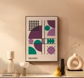 Questo poster giocoso e sofisticato è un classico omaggio alla scuola di design Bauhaus. La composizione è strutturata da una forte griglia di linee nere che ospita un vivace mix di forme geometriche: triangoli, cerchi e archi. L'opera bilancia grandi blocchi di colore, come il prugna intenso, il lilla tenue e il verde acqua, con motivi ripetitivi, tra cui un gruppo di piccoli triangoli neri e un cerchio viola a pois. Questo mix di ordine e geometria giocosa crea un'estetica unica e moderna. Questa stampa, scaricata in formato digitale, vanta una qualità superiore con una risoluzione di 7000x5000 pixel e 300 dpi. Questa