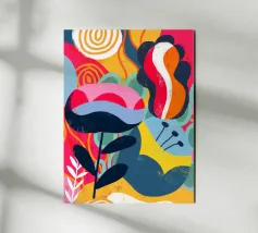 A bold abstract composition of stylized leaves and geometric shapes in primary colors of yellow, red, and blue, creating a vibrant and structured design.