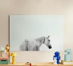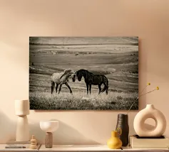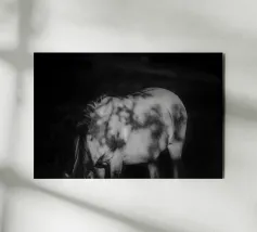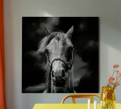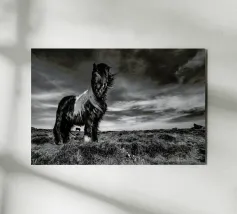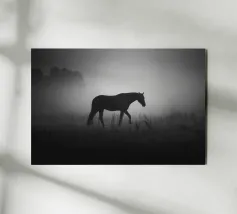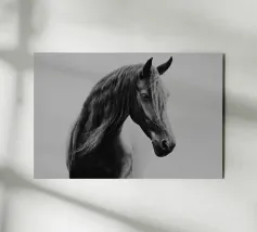 Puledro in piedi in un campo erboso in scala di grigi alluminio dibond