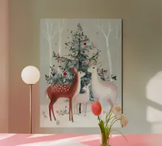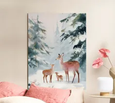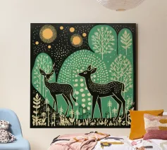 Raffigurazione di due cervi con uccelli in volo in una foresta alluminio dibond