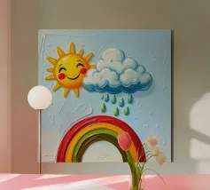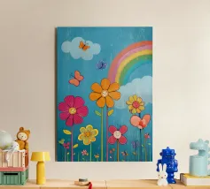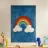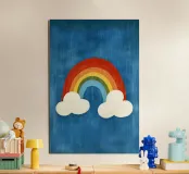 L'immagine mostra un arcobaleno stilizzato con sei archi colorati - dal rosso all'azzurro - su uno sfondo blu strutturato. Alle estremità dell'arcobaleno si trovano due nuvole bianche, che danno al motivo un tocco giocoso. Lo stile è chiaro, grafico e infantile, con colori vivaci e forme semplici che conferiscono un'atmosfera amichevole e ottimista. Ricorda le illustrazioni dei libri per bambini o i progetti per messaggi positivi e inclusivi.