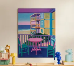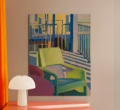 Un balcone assolato reso con luci e ombre drammatiche, dove il silenzio parla più delle parole grazie a una composizione minimalista.