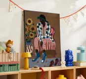 Questa opera d'arte mostra una persona seduta su una sedia a righe, circondata da girasoli e da una borsa verde. Lo sfondo è di un marrone tenue che crea un'atmosfera rustica e riflessiva.