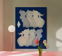 Un lupo bianco sembra emergere da una nuvola di nebbia su un suggestivo sfondo blu. La raffigurazione del lupo è morbida ed eterea, con i suoi dettagli che sfumano delicatamente nel vapore circostante.