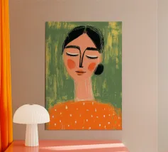 Un ritratto stilizzato mostra una donna con uno chignon appuntato, guance rosse e sguardo chiuso. Indossa un top color pesca con un motivo nero e una gonna a righe bianche e nere. Lo sfondo arancione, turchese e verde sottolinea la composizione grafica e minimalista.