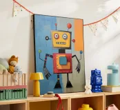 Aggiungete una scintilla di creatività a qualsiasi stanza con questo vivace poster da parete con robot! Caratterizzato da un robot eccentrico e colorato con audaci dettagli geometrici su uno sfondo blu e arancione, questo poster è perfetto per creare un ambiente divertente, giocoso e fantasioso. Ideale per le stanze dei bambini, le sale da gioco, le aule scolastiche o gli interni moderni che abbracciano un arredamento audace. Immaginate questo stravagante poster robotico che illumina una stanza dei giochi, aggiunge energia a una classe o conferisce personalità a uno spazio di lavoro creativo. I suoi colori vivaci e il suo design stravagante lo rendono un punto focale coinvolgente e memorabile per qualsiasi stanza.