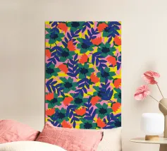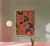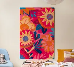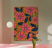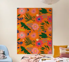 Un fitto disegno di fiori stilizzati in rosa caldo e blu scuro con centri arancioni su uno sfondo scuro. Lo stile è audace, vibrante e grafico.