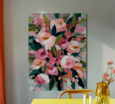 Un dipinto floreale astratto che fonde rosa tenue, oro e avorio con strati espressivi e strutturati. La tavolozza sognante e la pennellata tattile le conferiscono una qualità artigianale: elegante, senza tempo e piena di vita.