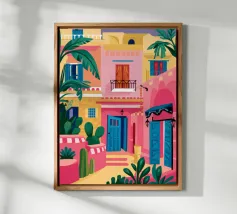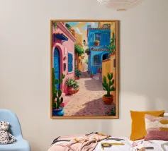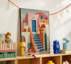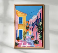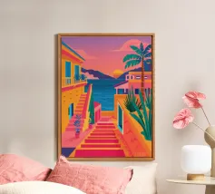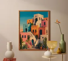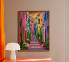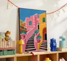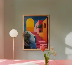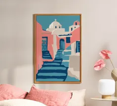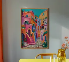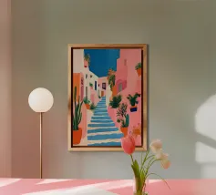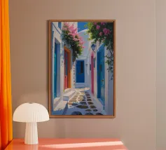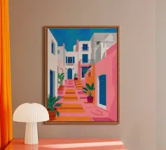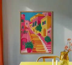 Quest'opera d'arte cattura la bellezza iconica di un'isola greca con i suoi gradini vivaci e colorati nei toni del rosa, dell'arancione e del rosso. La classica architettura bianca e blu incornicia la scena, creando un'immagine gioiosa e pittoresca che trasporta immediatamente in un vicolo soleggiato di Santorini.