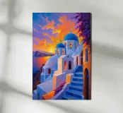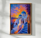 Uno squisito dipinto a olio che raffigura le iconiche chiese dalle cupole blu di Santorini sullo sfondo di un tramonto infuocato. Il caldo cielo arancione e viola si riflette sul tranquillo Mar Egeo, fondendosi armoniosamente con la nitida architettura imbiancata a calce. Le scale a chiocciola e le bouganville in fiore aggiungono dettagli intricati, creando un senso di profondità e invitando all'esplorazione. Questa opera d'arte cattura il romanticismo senza tempo e la serena bellezza dell'isola greca, evocando sentimenti di vagabondaggio e pace.