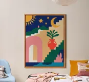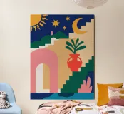 Una scena d'interni stravagante e astratta con una scala rosa, piante in vaso e un sole e una luna nel cielo visti attraverso un arco. L'opera d'arte è un paesaggio da sogno giocoso e bohémien.