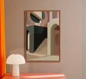 Uno spazio architettonico astratto è definito da una scalinata spoglia e da archi sovrapposti, con un drammatico gioco di luci e ombre che crea una composizione potente e minimalista.