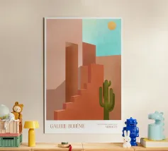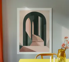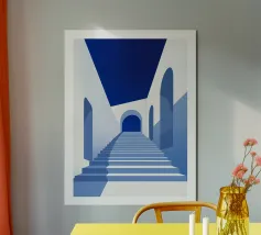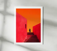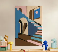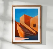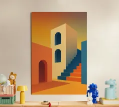 Un poster artistico che presenta un'architettura astratta con scale geometriche e calde tonalità arancioni sotto un cielo blu brillante. Ideale per una decorazione moderna e originale della cameretta dei bambini, questo visual evoca design, creatività e prospettiva. Perfetto per stimolare l'immaginazione dei piccoli sognatori.