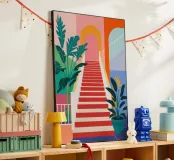Scale rosse e vivaci conducono attraverso un edificio colorato e semplificato verso un lussureggiante ingresso ad arco, suggerendo un viaggio verso una destinazione bella ed esotica.