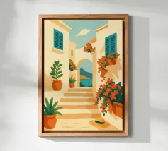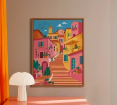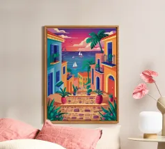 Una vista mozzafiato su una vibrante scalinata mediterranea, fiancheggiata da edifici colorati e palme rigogliose. La prospettiva attira lo sguardo verso l'alto, verso un cielo luminoso, creando un senso di ottimismo, avventura e il sogno di una perfetta fuga estiva.