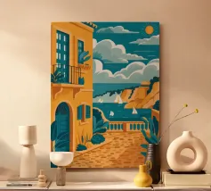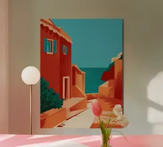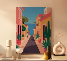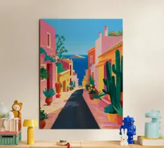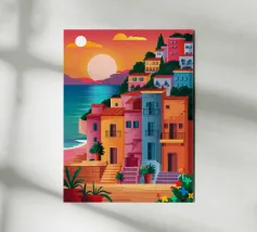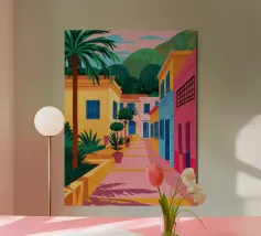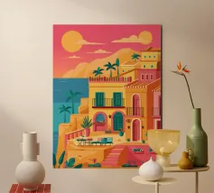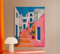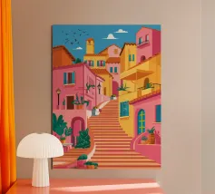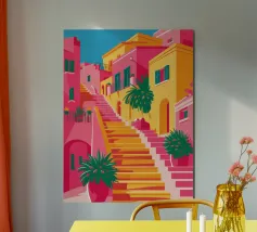 Una vista mozzafiato su una vibrante scalinata mediterranea, fiancheggiata da edifici colorati e palme rigogliose. La prospettiva attira lo sguardo verso l'alto, verso un cielo luminoso, creando un senso di ottimismo, avventura e il sogno di una perfetta fuga estiva.