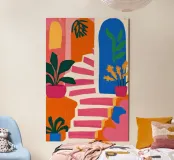 Un'illustrazione astratta mostra una scala colorata adornata da una varietà di piante in vaso, fondendo architettura e botanica in una composizione vivace e moderna.