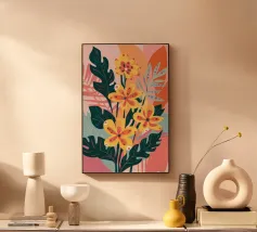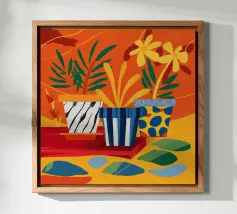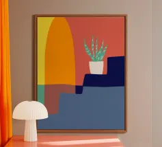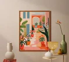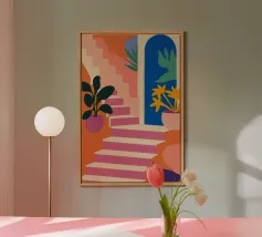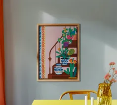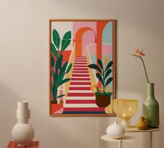 Un'illustrazione astratta mostra una scala colorata adornata da una varietà di piante in vaso, fondendo architettura e botanica in una composizione vivace e moderna.
