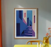 Un'illustrazione moderna e colorata con due gatti neri in un contesto architettonico di vicoli e scale dalle vibranti tonalità di blu e rosa. Il gioco di luci e ombre aggiunge un'atmosfera misteriosa e accattivante, ideale per evocare eleganza e intrigo in uno stile contemporaneo.