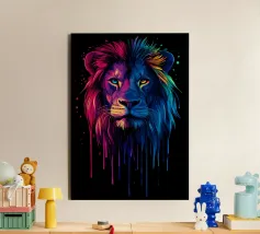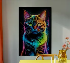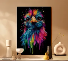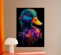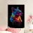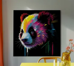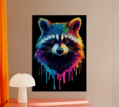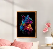 Uno scoiattolo curioso si affaccia vivacemente dal quadro, raffigurato con colori intensi e brillanti su uno sfondo nero. La tavolozza dei colori spazia dal blu intenso e dal rosa brillante al giallo caldo e al rosso vibrante. I passaggi sono fluidi e ricordano le pennellate, mentre singoli schizzi e gocce di colore conferiscono al motivo un effetto dinamico, quasi esplosivo. L'animale appare vigile e vivace, con dettagli finemente lavorati nella sua pelliccia e un grande occhio lucido che guarda direttamente lo spettatore.
