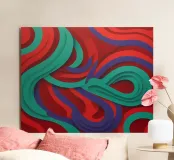Un audace motivo astratto con un tocco di energia dinamica che simboleggia il movimento e la fluidità. Colori vivaci che evocano temi come l'acqua, la vita e il movimento. Una fusione innovativa di tradizione e modernità per interni contemporanei e minimalisti. Un linguaggio visivo unico che supera i confini culturali.