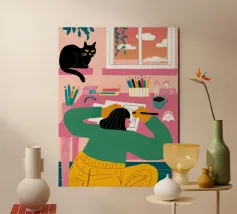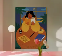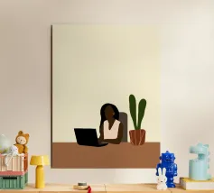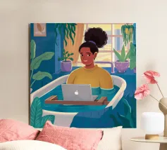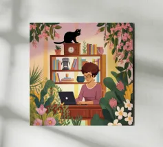 Una persona lavora al computer portatile circondata da libri, carte ed elementi decorativi. Le piante e l'ambiente caldo migliorano l'ambiente produttivo.