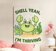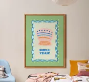 Conchiglia rosa con cornice decorativa su sfondo verde con il testo Shell yeah! Per tutti gli amanti della spiaggia!
