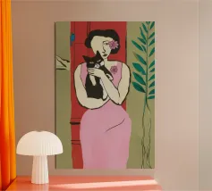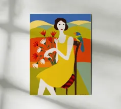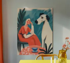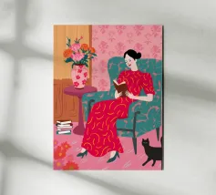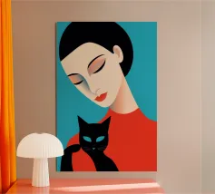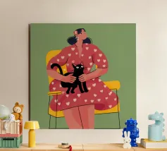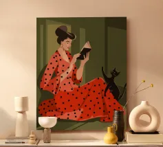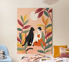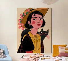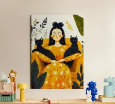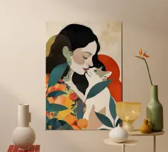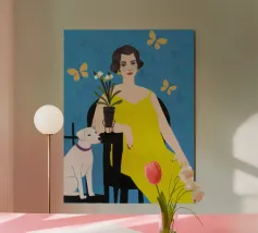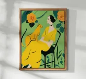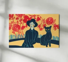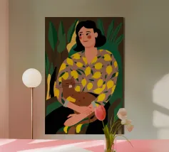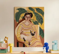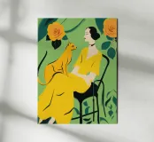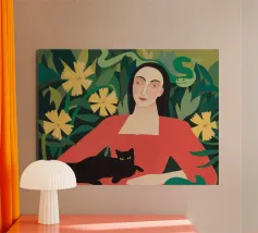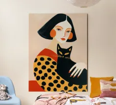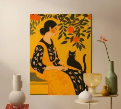 Questa composizione grafica combina la raffinatezza dell'Art Déco con una riduzione moderna. Una statuaria signora in abito giallo sole condivide un momento di tranquillità con il suo gatto, circondato da rose lussureggianti. Le linee chiare ricordano Toulouse-Lautrec e le xilografie giapponesi, mentre l'armoniosa palette di colori chartreuse, oro e smeraldo irradia pura freschezza. La femminilità senza tempo incontra la perfezione decorativa: un'opera d'arte che riempie gli ambienti con una grazia giocosa e una leggerezza mediterranea primaverile. Incantevole ed elegante!