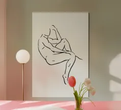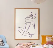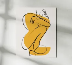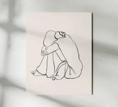Un semplice disegno al tratto raffigura una persona seduta con i capelli ricci, le braccia avvolte intorno alle ginocchia. Lo stile minimalista utilizza linee morbide e fluide per trasmettere un senso di calma e introspezione.
