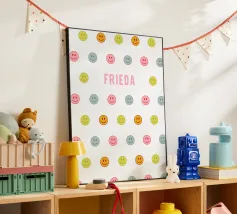 Il motivo colorato Faccine sorridenti è un semplice ma accattivante motivo luminoso nei colori rosa, arancione, giallo e rosso. Presenta molte facce sorridenti che mettono di buon umore. Motivo felice e ottimista ispirato allo stile retrò anni '70 di showmemars