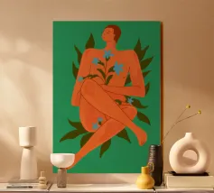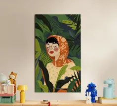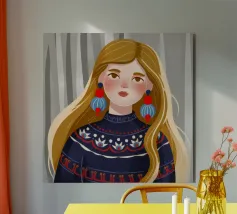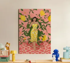 Questa opera d'arte raffigura una persona con capelli corti e biondi che indossa una giacca floreale e tiene in mano un libro. Lo sfondo giallo brillante ne esalta l'essenza chic ed elegante.