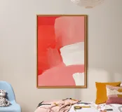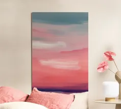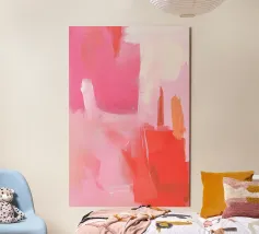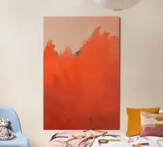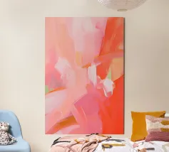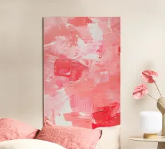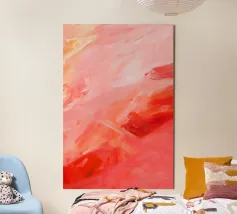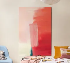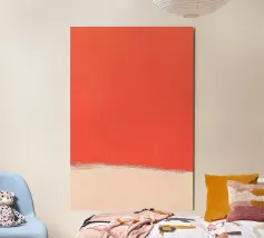 Questa composizione astratta è costruita intorno a una delicata tensione tra i toni audaci del rosso corallo e quelli attenuati del fard, interrotti da un luminoso passaggio in bianco. I colori si incontrano e si sovrappongono in ampi blocchi pittorici, creando un senso di struttura senza rigidità. La tavolozza rimane calda e coesa, con il bianco che agisce come un respiro tranquillo all'interno del campo di colori.