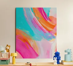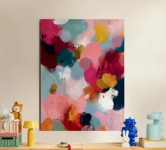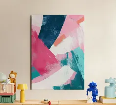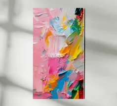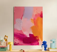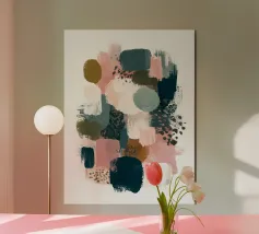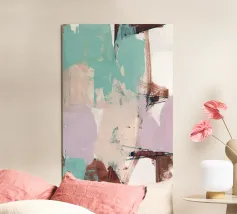 Pennellate strutturate nei toni del rosa, della salvia e della sabbia evocano paesaggi naturali. Una composizione tattile e rilassante che incarna il calore del minimalismo astratto.